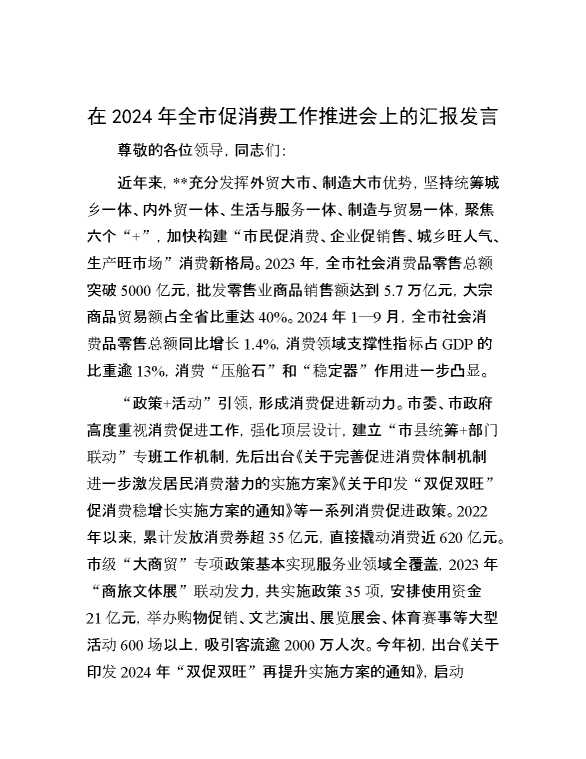 在2024年全市促消费工作推进会上的汇报发言 2024-12-09 Word模板 86 购买前,请一定要先点击这里看看,欢迎持续关注,精彩模板每天推送 预览结束,本文件为word文档,一共7页,共3518字,请购买后,下载后查看 购买前,请一定要先点击这里看看,欢迎持续关注,精彩模板每天推送 资源下载下载价格29 RMBVIP免费升级VIP点击检测网盘有效后购买有任何充值和下载问题请加微信:xuexixuexi66 0 演讲发言