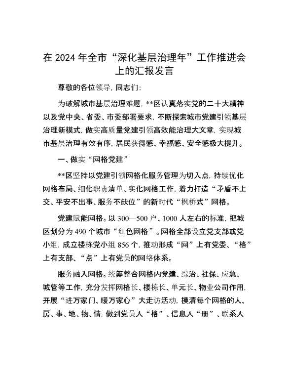 在2024年全市“深化基层治理年”工作推进会上的汇报发言 2024-12-09 Word模板 87 购买前,请一定要先点击这里看看,欢迎持续关注,精彩模板每天推送 预览结束,本文件为word文档,一共7页,共2715字,请购买后,下载后查看 购买前,请一定要先点击这里看看,欢迎持续关注,精彩模板每天推送 资源下载下载价格29 RMBVIP免费升级VIP点击检测网盘有效后购买有任何充值和下载问题请加微信:xuexixuexi66 0 演讲发言