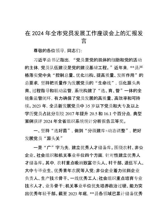 在2024年全市党员发展工作座谈会上的汇报发言 2024-12-09 Word模板 86 购买前,请一定要先点击这里看看,欢迎持续关注,精彩模板每天推送 预览结束,本文件为word文档,一共8页,共3579字,请购买后,下载后查看 购买前,请一定要先点击这里看看,欢迎持续关注,精彩模板每天推送 资源下载下载价格29 RMBVIP免费升级VIP点击检测网盘有效后购买有任何充值和下载问题请加微信:xuexixuexi66 0 演讲发言
