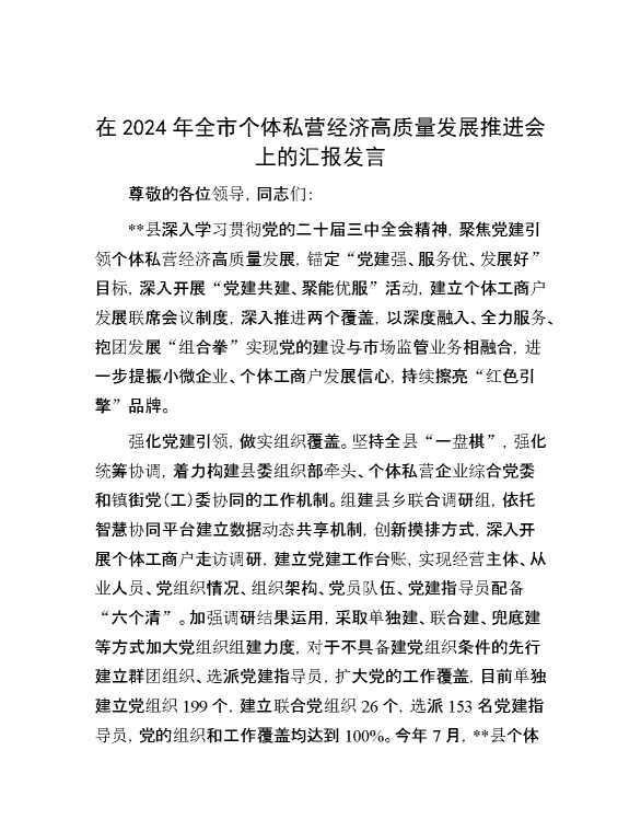 在2024年全市个体私营经济高质量发展推进会上的汇报发言 2024-12-09 Word模板 82 购买前,请一定要先点击这里看看,欢迎持续关注,精彩模板每天推送 预览结束,本文件为word文档,一共6页,共2589字,请购买后,下载后查看 购买前,请一定要先点击这里看看,欢迎持续关注,精彩模板每天推送 资源下载下载价格29 RMBVIP免费升级VIP点击检测网盘有效后购买有任何充值和下载问题请加微信:xuexixuexi66 0 演讲发言