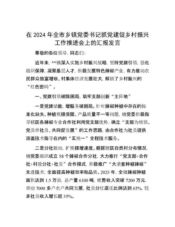 在2024年全市乡镇党委书记抓党建促乡村振兴工作推进会上的汇报发言 2024-12-09 Word模板 85 购买前,请一定要先点击这里看看,欢迎持续关注,精彩模板每天推送 预览结束,本文件为word文档,一共6页,共2482字,请购买后,下载后查看 购买前,请一定要先点击这里看看,欢迎持续关注,精彩模板每天推送 资源下载下载价格29 RMBVIP免费升级VIP点击检测网盘有效后购买有任何充值和下载问题请加微信:xuexixuexi66 0 演讲发言