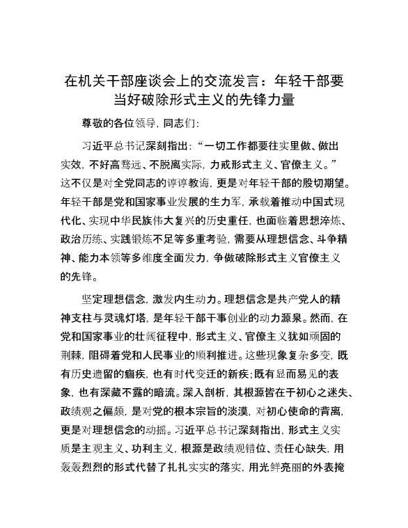 在机关干部座谈会上的交流发言:年轻干部要当好破除形式主义的先锋力量 2024-12-09 Word模板 91 购买前,请一定要先点击这里看看,欢迎持续关注,精彩模板每天推送 预览结束,本文件为word文档,一共6页,共2968字,请购买后,下载后查看 购买前,请一定要先点击这里看看,欢迎持续关注,精彩模板每天推送 资源下载下载价格29 RMBVIP免费升级VIP点击检测网盘有效后购买有任何充值和下载问题请加微信:xuexixuexi66 0 演讲发言
