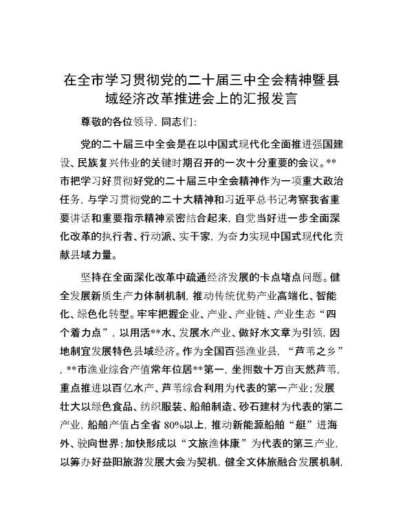 在全市学习贯彻党的二十届三中全会精神暨县域经济改革推进会上的汇报发言 2024-12-09 Word模板 95 购买前,请一定要先点击这里看看,欢迎持续关注,精彩模板每天推送 预览结束,本文件为word文档,一共4页,共1944字,请购买后,下载后查看 购买前,请一定要先点击这里看看,欢迎持续关注,精彩模板每天推送 资源下载下载价格29 RMBVIP免费升级VIP点击检测网盘有效后购买有任何充值和下载问题请加微信:xuexixuexi66 0 演讲发言