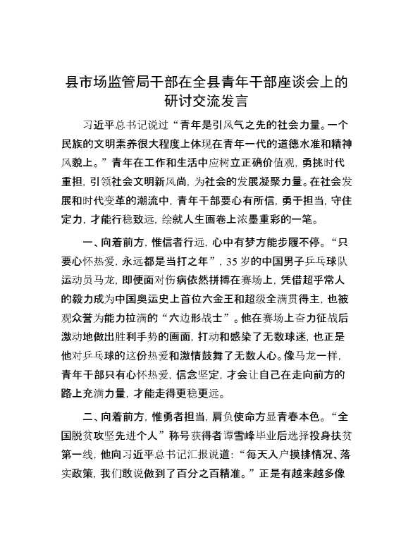 县市场监管局干部在全县青年干部座谈会上的研讨交流发言 2024-12-09 Word模板 86 购买前,请一定要先点击这里看看,欢迎持续关注,精彩模板每天推送 预览结束,本文件为word文档,一共3页,共1223字,请购买后,下载后查看 购买前,请一定要先点击这里看看,欢迎持续关注,精彩模板每天推送 资源下载下载价格29 RMBVIP免费升级VIP点击检测网盘有效后购买有任何充值和下载问题请加微信:xuexixuexi66 0 演讲发言