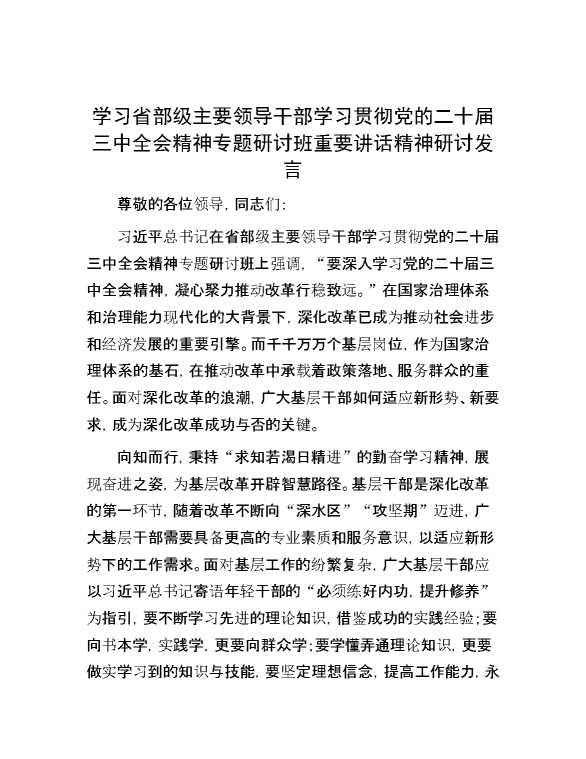 学习省部级主要领导干部学习贯彻党的二十届三中全会精神专题研讨班重要讲话精神研讨发言 2024-12-09 Word模板 88 购买前,请一定要先点击这里看看,欢迎持续关注,精彩模板每天推送 预览结束,本文件为word文档,一共4页,共1868字,请购买后,下载后查看 购买前,请一定要先点击这里看看,欢迎持续关注,精彩模板每天推送 资源下载下载价格29 RMBVIP免费升级VIP点击检测网盘有效后购买有任何充值和下载问题请加微信:xuexixuexi66 0 演讲发言