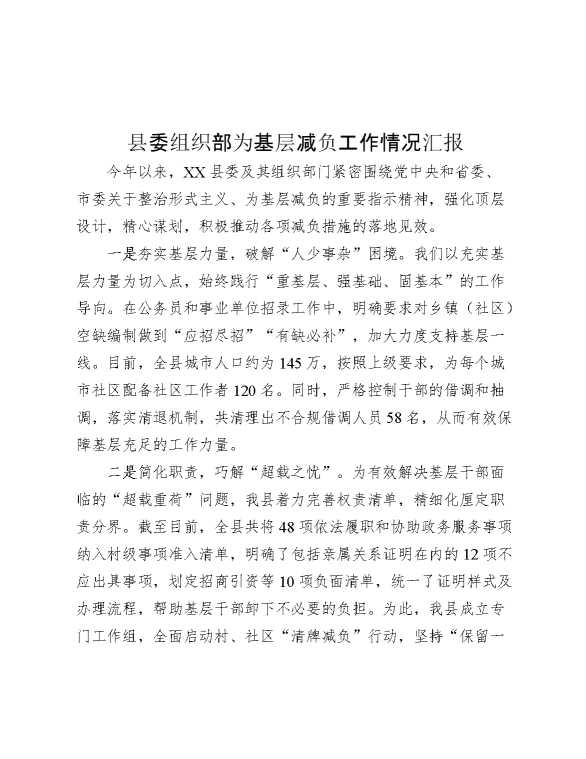 县委组织部为基层减负工作情况汇报 2024-12-16 Word模板 93 购买前,请一定要先点击这里看看,欢迎持续关注,精彩模板每天推送 预览结束,本文件为word文档,一共4页,共1424字,请购买后,下载后查看 购买前,请一定要先点击这里看看,欢迎持续关注,精彩模板每天推送 资源下载下载价格29 RMBVIP免费升级VIP点击检测网盘有效后购买有任何充值和下载问题请加微信:xuexixuexi66 0 总结汇报