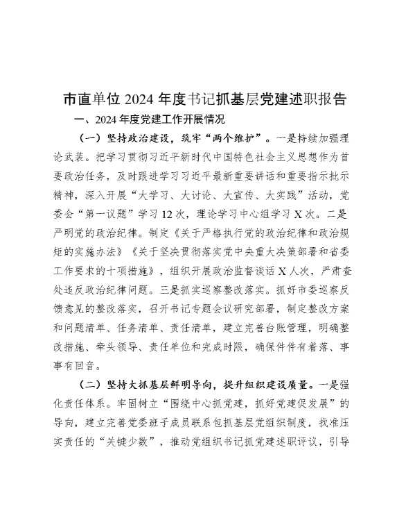 市直单位2024年度书记抓基层党建述职报告 2024-12-16 Word模板 106 购买前,请一定要先点击这里看看,欢迎持续关注,精彩模板每天推送 预览结束,本文件为word文档,一共7页,共2937字,请购买后,下载后查看 购买前,请一定要先点击这里看看,欢迎持续关注,精彩模板每天推送 资源下载下载价格29 RMBVIP免费升级VIP点击检测网盘有效后购买有任何充值和下载问题请加微信:xuexixuexi66 0 总结汇报