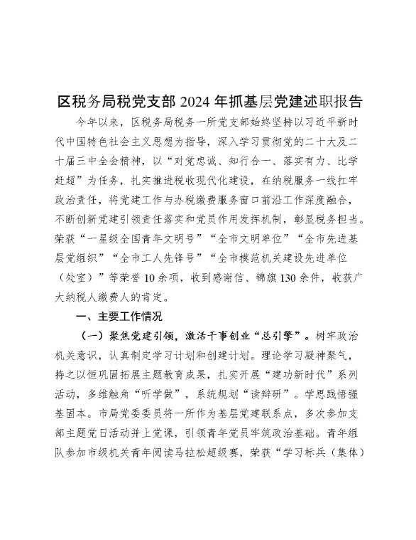 区税务局税党支部2024年抓基层党建述职报告 2024-12-16 Word模板 107 购买前,请一定要先点击这里看看,欢迎持续关注,精彩模板每天推送 预览结束,本文件为word文档,一共5页,共1804字,请购买后,下载后查看 购买前,请一定要先点击这里看看,欢迎持续关注,精彩模板每天推送 资源下载下载价格29 RMBVIP免费升级VIP立即购买有任何充值和下载问题请加微信:xuexixuexi66 0 总结汇报