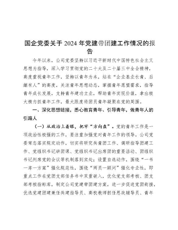 国企党委关于2024年党建带团建工作情况的报告 2024-12-16 Word模板 95 购买前,请一定要先点击这里看看,欢迎持续关注,精彩模板每天推送 预览结束,本文件为word文档,一共6页,共2310字,请购买后,下载后查看 购买前,请一定要先点击这里看看,欢迎持续关注,精彩模板每天推送 资源下载下载价格29 RMBVIP免费升级VIP点击检测网盘有效后购买有任何充值和下载问题请加微信:xuexixuexi66 0 总结汇报