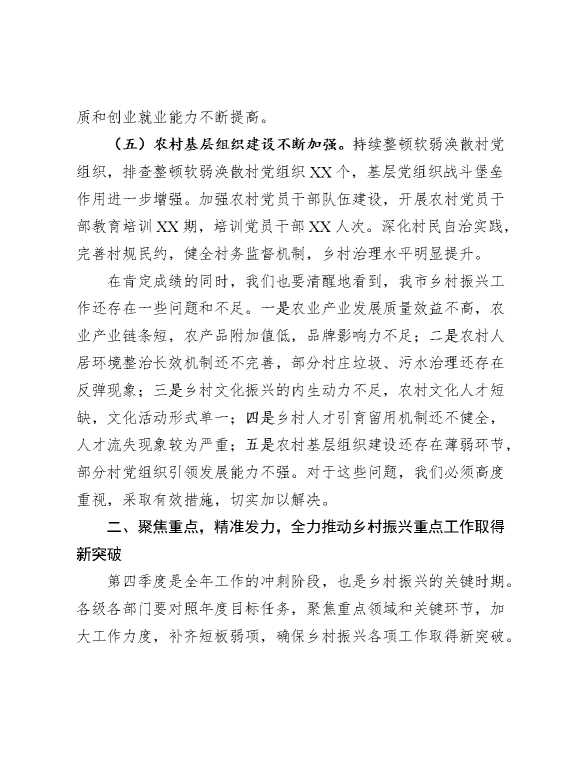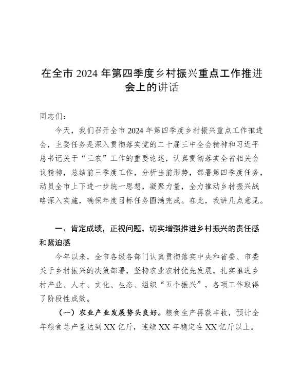 在全市2024年第四季度乡村振兴重点工作推进会上的讲话 2024-12-19 Word模板 60 购买前,请一定要先点击这里看看,欢迎持续关注,精彩模板每天推送 预览结束,本文件为word文档,一共8页,共3458字,请购买后,下载后查看 购买前,请一定要先点击这里看看,欢迎持续关注,精彩模板每天推送 资源下载下载价格29 RMBVIP免费升级VIP点击检测网盘有效后购买有任何充值和下载问题请加微信:xuexixuexi66 0 演讲发言