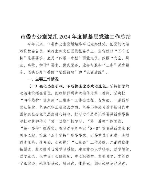 市委办公室党组2024年度抓基层党建工作总结 2024-12-19 Word模板 64 购买前,请一定要先点击这里看看,欢迎持续关注,精彩模板每天推送 预览结束,本文件为word文档,一共5页,共2171字,请购买后,下载后查看 购买前,请一定要先点击这里看看,欢迎持续关注,精彩模板每天推送 资源下载下载价格29 RMBVIP免费升级VIP点击检测网盘有效后购买有任何充值和下载问题请加微信:xuexixuexi66 0 总结汇报