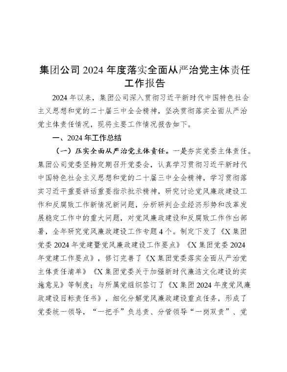 集团公司2024年度落实全面从严治党主体责任工作报告 2024-12-19 Word模板 89 购买前,请一定要先点击这里看看,欢迎持续关注,精彩模板每天推送 预览结束,本文件为word文档,一共8页,共3535字,请购买后,下载后查看 购买前,请一定要先点击这里看看,欢迎持续关注,精彩模板每天推送 资源下载下载价格29 RMBVIP免费升级VIP点击检测网盘有效后购买有任何充值和下载问题请加微信:xuexixuexi66 0 总结汇报