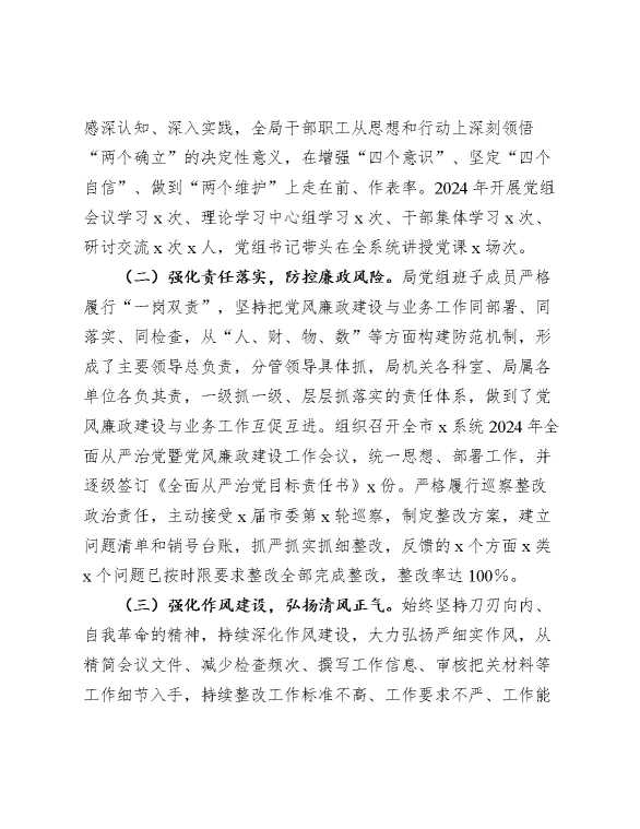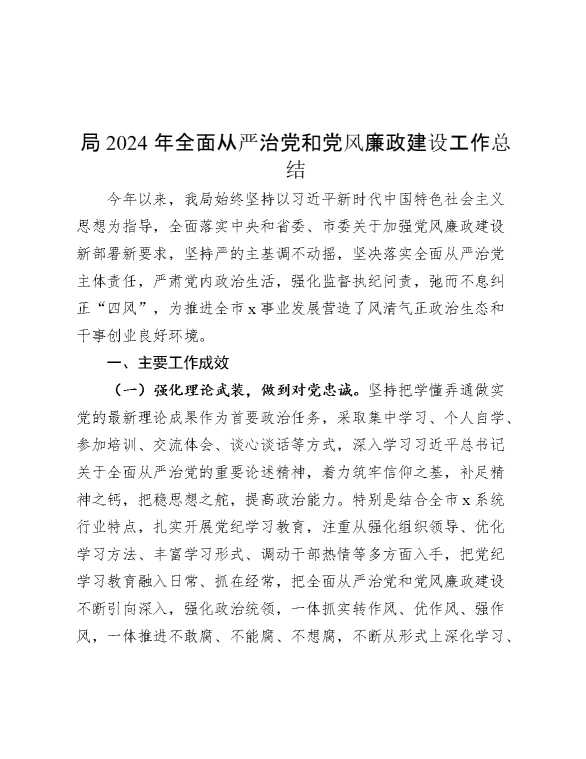 局2024年全面从严治党和党风廉政建设工作总结 2024-12-19 Word模板 99 购买前,请一定要先点击这里看看,欢迎持续关注,精彩模板每天推送 预览结束,本文件为word文档,一共6页,共2652字,请购买后,下载后查看 购买前,请一定要先点击这里看看,欢迎持续关注,精彩模板每天推送 资源下载下载价格29 RMBVIP免费升级VIP点击检测网盘有效后购买有任何充值和下载问题请加微信:xuexixuexi66 0 总结汇报