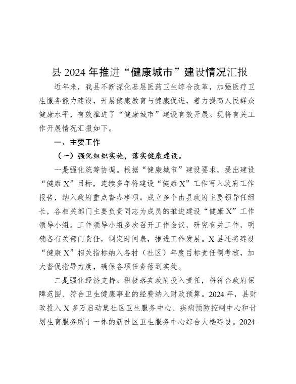 县2024年推进“健康城市”建设情况汇报 2024-12-19 Word模板 101 购买前,请一定要先点击这里看看,欢迎持续关注,精彩模板每天推送 预览结束,本文件为word文档,一共9页,共4128字,请购买后,下载后查看 购买前,请一定要先点击这里看看,欢迎持续关注,精彩模板每天推送 资源下载下载价格29 RMBVIP免费升级VIP点击检测网盘有效后购买有任何充值和下载问题请加微信:xuexixuexi66 0 总结汇报