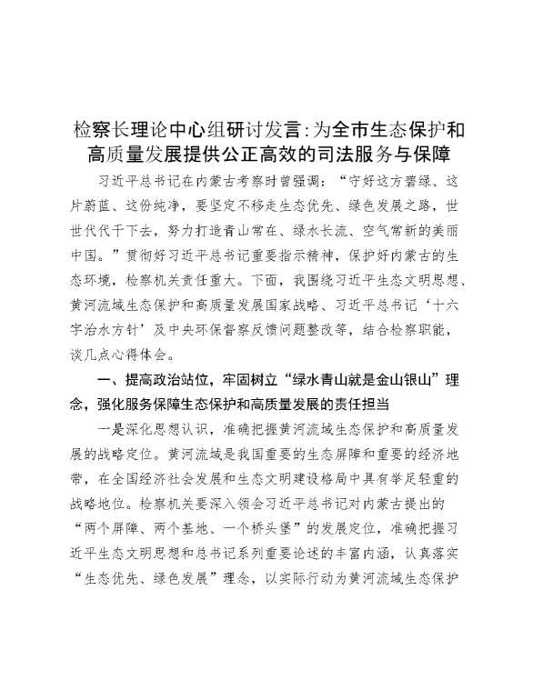 检察长理论中心组研讨发言:为全市生态保护和高质量发展提供公正高效的司法服务与保障 2024-12-27 Word模板 53 购买前,请一定要先点击这里看看,欢迎持续关注,精彩模板每天推送 预览结束,本文件为word文档,一共5页,共1955字,请购买后,下载后查看 购买前,请一定要先点击这里看看,欢迎持续关注,精彩模板每天推送 资源下载下载价格29 RMBVIP免费升级VIP点击检测网盘有效后购买有任何充值和下载问题请加微信:xuexixuexi66 0 演讲发言