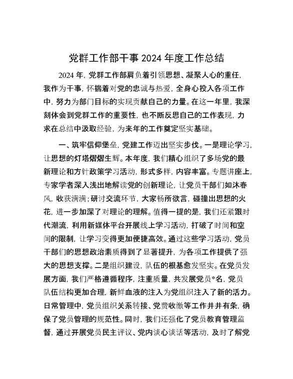 党群工作部干事2024年度工作总结 2025-01-06 Word模板 57 购买前,请一定要先点击这里看看,欢迎持续关注,精彩模板每天推送 预览结束,本文件为word文档,一共6页,共2747字,请购买后,下载后查看 购买前,请一定要先点击这里看看,欢迎持续关注,精彩模板每天推送 资源下载下载价格29 RMBVIP免费升级VIP点击检测网盘有效后购买有任何充值和下载问题请加微信:xuexixuexi66 0 总结汇报