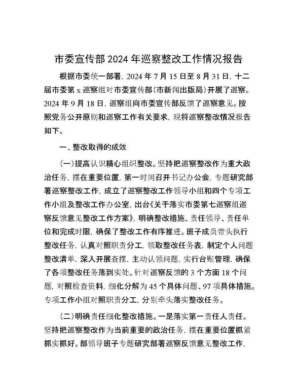 市委宣传部2024年巡察整改工作情况报告 2025-01-06 Word模板 86 购买前,请一定要先点击这里看看,欢迎持续关注,精彩模板每天推送 预览结束,本文件为word文档,一共5页,共2345字,请购买后,下载后查看 购买前,请一定要先点击这里看看,欢迎持续关注,精彩模板每天推送 资源下载下载价格29 RMBVIP免费升级VIP点击检测网盘有效后购买有任何充值和下载问题请加微信:xuexixuexi66 0 总结汇报