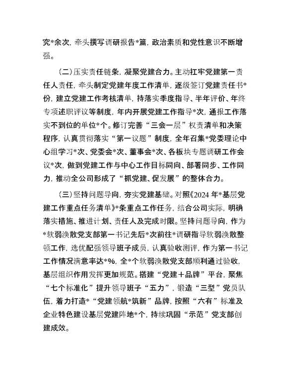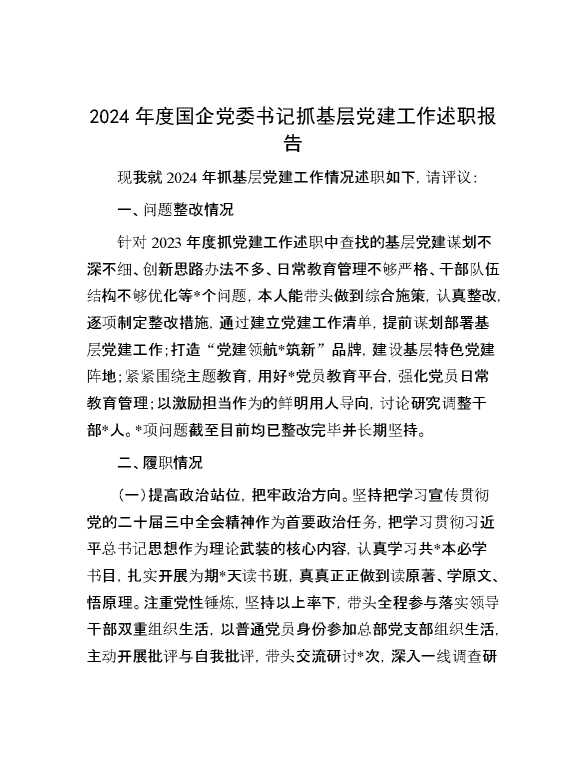 2024年度国企党委书记抓基层党建工作述职报告 2025-01-06 Word模板 84 购买前,请一定要先点击这里看看,欢迎持续关注,精彩模板每天推送 预览结束,本文件为word文档,一共6页,共2606字,请购买后,下载后查看 购买前,请一定要先点击这里看看,欢迎持续关注,精彩模板每天推送 资源下载下载价格29 RMBVIP免费升级VIP点击检测网盘有效后购买有任何充值和下载问题请加微信:xuexixuexi66 0 总结汇报