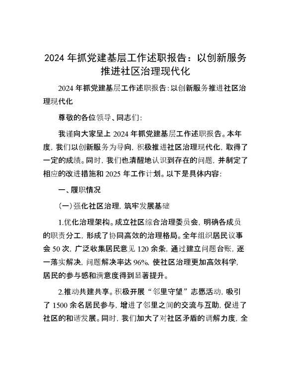 2024年抓党建基层工作述职报告:以创新服务推进社区治理现代化 2025-01-06 Word模板 92 购买前,请一定要先点击这里看看,欢迎持续关注,精彩模板每天推送 预览结束,本文件为word文档,一共7页,共2670字,请购买后,下载后查看 购买前,请一定要先点击这里看看,欢迎持续关注,精彩模板每天推送 资源下载下载价格29 RMBVIP免费升级VIP点击检测网盘有效后购买有任何充值和下载问题请加微信:xuexixuexi66 0 总结汇报