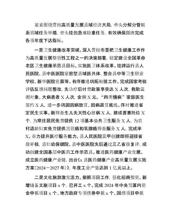 副县长2024年述职报告 2025-01-06 Word模板 124 购买前,请一定要先点击这里看看,欢迎持续关注,精彩模板每天推送 预览结束,本文件为word文档,一共5页,共2426字,请购买后,下载后查看 购买前,请一定要先点击这里看看,欢迎持续关注,精彩模板每天推送 资源下载下载价格29 RMBVIP免费升级VIP点击检测网盘有效后购买有任何充值和下载问题请加微信:xuexixuexi66 0 总结汇报