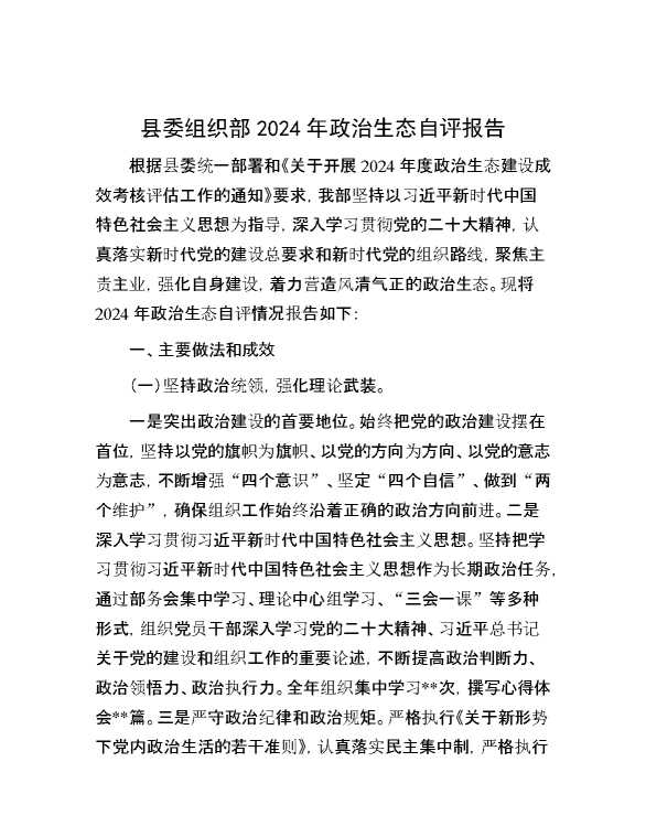 县委组织部2024年政治生态自评报告 2025-01-06 Word模板 80 购买前,请一定要先点击这里看看,欢迎持续关注,精彩模板每天推送 预览结束,本文件为word文档,一共6页,共2697字,请购买后,下载后查看 购买前,请一定要先点击这里看看,欢迎持续关注,精彩模板每天推送 资源下载下载价格29 RMBVIP免费升级VIP点击检测网盘有效后购买有任何充值和下载问题请加微信:xuexixuexi66 0 总结汇报