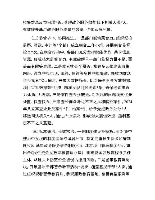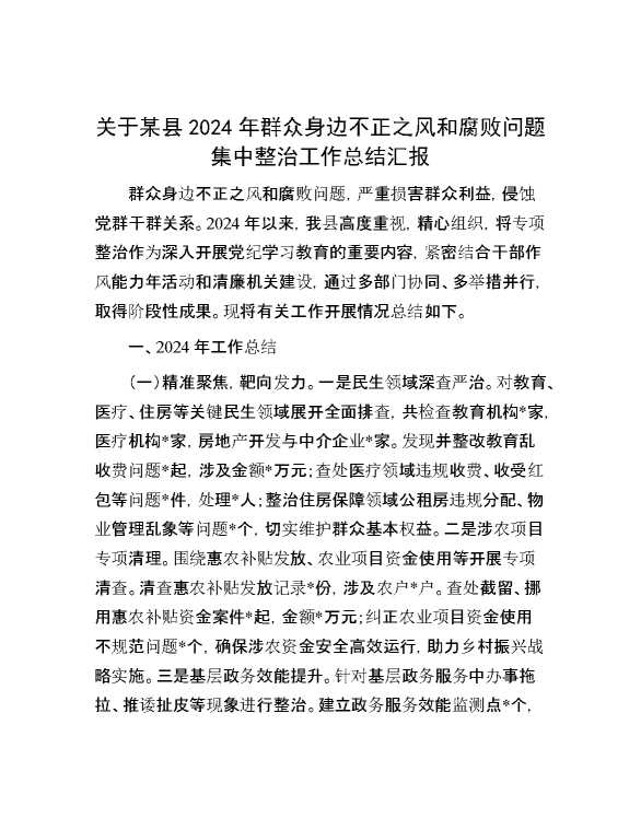 关于某县2024年群众身边不正之风和腐败问题集中整治工作总结汇报 2025-01-06 Word模板 88 购买前,请一定要先点击这里看看,欢迎持续关注,精彩模板每天推送 预览结束,本文件为word文档,一共7页,共3483字,请购买后,下载后查看 购买前,请一定要先点击这里看看,欢迎持续关注,精彩模板每天推送 资源下载下载价格29 RMBVIP免费升级VIP点击检测网盘有效后购买有任何充值和下载问题请加微信:xuexixuexi66 0 总结汇报