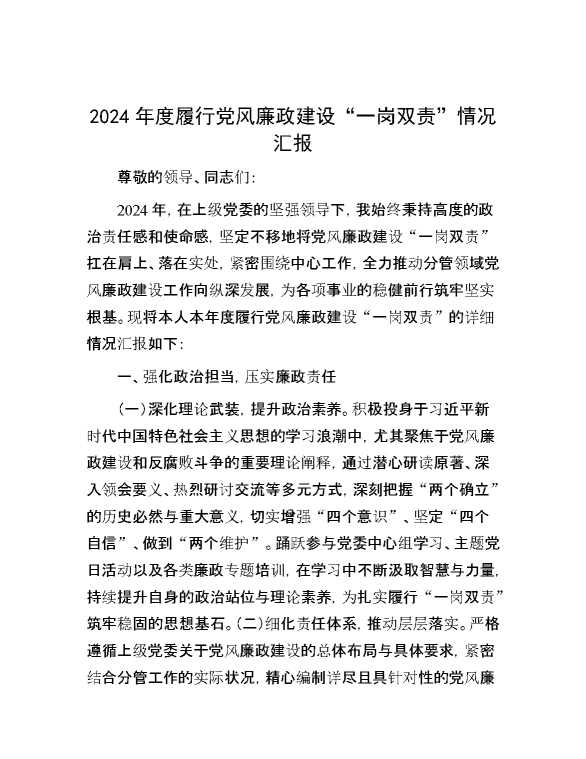 2024年度履行党风廉政建设“一岗双责”情况汇报 2025-01-06 Word模板 91 购买前,请一定要先点击这里看看,欢迎持续关注,精彩模板每天推送 预览结束,本文件为word文档,一共7页,共3496字,请购买后,下载后查看 购买前,请一定要先点击这里看看,欢迎持续关注,精彩模板每天推送 资源下载下载价格29 RMBVIP免费升级VIP点击检测网盘有效后购买有任何充值和下载问题请加微信:xuexixuexi66 0 总结汇报