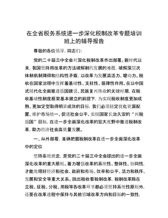 在全省税务系统进一步深化税制改革专题培训班上的辅导报告 2025-01-14 Word模板 63 购买前,请一定要先点击这里看看,欢迎持续关注,精彩模板每天推送 预览结束,本文件为word文档,一共14页,共7022字,请购买后,下载后查看 购买前,请一定要先点击这里看看,欢迎持续关注,精彩模板每天推送 资源下载下载价格29 RMBVIP免费升级VIP点击检测网盘有效后购买有任何充值和下载问题请加微信:xuexixuexi66 0 总结汇报