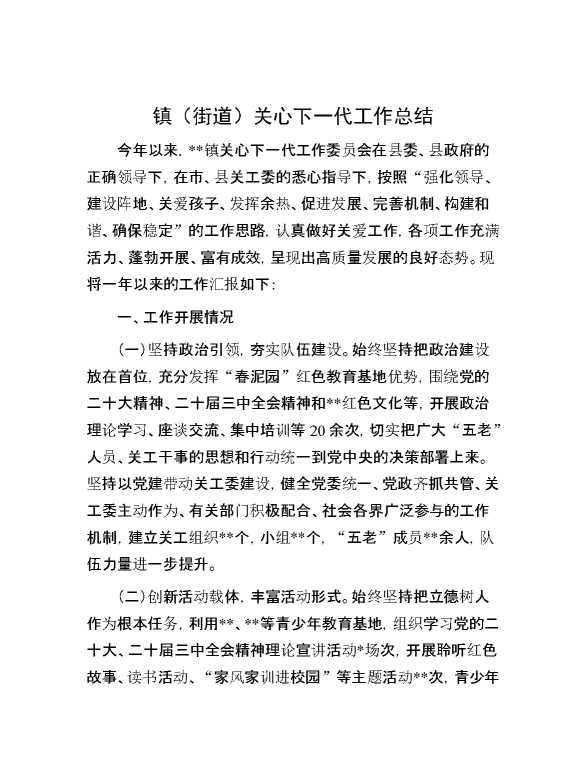 镇(街道)关心下一代工作总结 2025-01-14 Word模板 77 购买前,请一定要先点击这里看看,欢迎持续关注,精彩模板每天推送 预览结束,本文件为word文档,一共3页,共1204字,请购买后,下载后查看 购买前,请一定要先点击这里看看,欢迎持续关注,精彩模板每天推送 资源下载下载价格29 RMBVIP免费升级VIP点击检测网盘有效后购买有任何充值和下载问题请加微信:xuexixuexi66 0 总结汇报