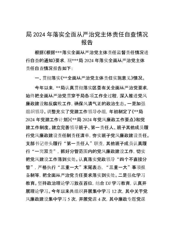 局2024年落实全面从严治党主体责任自查情况报告 2025-01-14 Word模板 92 购买前,请一定要先点击这里看看,欢迎持续关注,精彩模板每天推送 预览结束,本文件为word文档,一共5页,共2480字,请购买后,下载后查看 购买前,请一定要先点击这里看看,欢迎持续关注,精彩模板每天推送 资源下载下载价格29 RMBVIP免费升级VIP点击检测网盘有效后购买有任何充值和下载问题请加微信:xuexixuexi66 0 总结汇报