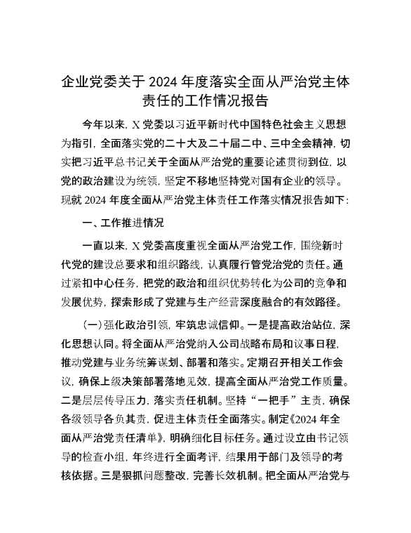 企业党委关于2024年度落实全面从严治党主体责任的工作情况报告 2025-01-14 Word模板 104 购买前,请一定要先点击这里看看,欢迎持续关注,精彩模板每天推送 预览结束,本文件为word文档,一共6页,共2872字,请购买后,下载后查看 购买前,请一定要先点击这里看看,欢迎持续关注,精彩模板每天推送 资源下载下载价格29 RMBVIP免费升级VIP点击检测网盘有效后购买有任何充值和下载问题请加微信:xuexixuexi66 0 总结汇报