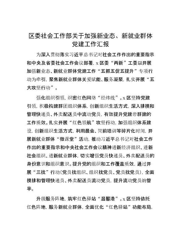 区委社会工作部关于加强新业态、新就业群体党建工作汇报 2025-01-14 Word模板 103 购买前,请一定要先点击这里看看,欢迎持续关注,精彩模板每天推送 预览结束,本文件为word文档,一共4页,共1543字,请购买后,下载后查看 购买前,请一定要先点击这里看看,欢迎持续关注,精彩模板每天推送 资源下载下载价格29 RMBVIP免费升级VIP点击检测网盘有效后购买有任何充值和下载问题请加微信:xuexixuexi66 0 总结汇报