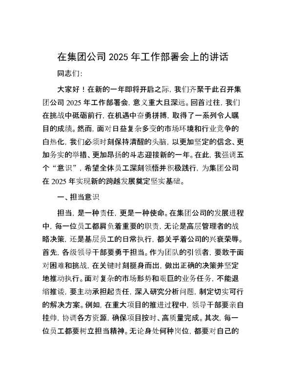 在集团公司2025年工作部署会上的讲话 2025-01-14 Word模板 63 购买前,请一定要先点击这里看看,欢迎持续关注,精彩模板每天推送 预览结束,本文件为word文档,一共5页,共2429字,请购买后,下载后查看 购买前,请一定要先点击这里看看,欢迎持续关注,精彩模板每天推送 资源下载下载价格29 RMBVIP免费升级VIP点击检测网盘有效后购买有任何充值和下载问题请加微信:xuexixuexi66 0 演讲发言