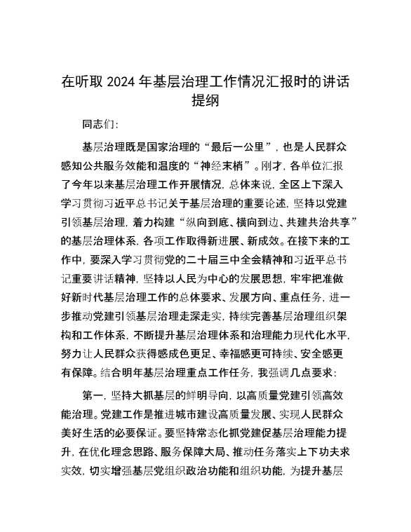 在听取2024年基层治理工作情况汇报时的讲话提纲 2025-01-14 Word模板 61 购买前,请一定要先点击这里看看,欢迎持续关注,精彩模板每天推送 预览结束,本文件为word文档,一共6页,共3159字,请购买后,下载后查看 购买前,请一定要先点击这里看看,欢迎持续关注,精彩模板每天推送 资源下载下载价格29 RMBVIP免费升级VIP点击检测网盘有效后购买有任何充值和下载问题请加微信:xuexixuexi66 0 演讲发言