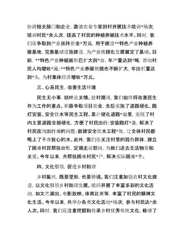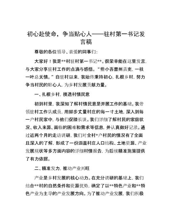 初心赴使命,争当贴心人——驻村第一书记发言稿 2025-01-14 Word模板 55 购买前,请一定要先点击这里看看,欢迎持续关注,精彩模板每天推送 预览结束,本文件为word文档,一共4页,共1454字,请购买后,下载后查看 购买前,请一定要先点击这里看看,欢迎持续关注,精彩模板每天推送 资源下载下载价格29 RMBVIP免费升级VIP点击检测网盘有效后购买有任何充值和下载问题请加微信:xuexixuexi66 0 演讲发言
