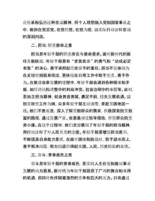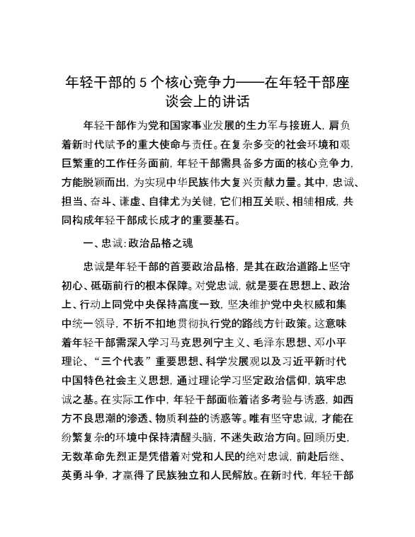 年轻干部的5个核心竞争力——在年轻干部座谈会上的讲话 2025-01-14 Word模板 56 购买前,请一定要先点击这里看看,欢迎持续关注,精彩模板每天推送 预览结束,本文件为word文档,一共5页,共2068字,请购买后,下载后查看 购买前,请一定要先点击这里看看,欢迎持续关注,精彩模板每天推送 资源下载下载价格29 RMBVIP免费升级VIP点击检测网盘有效后购买有任何充值和下载问题请加微信:xuexixuexi66 0 演讲发言
