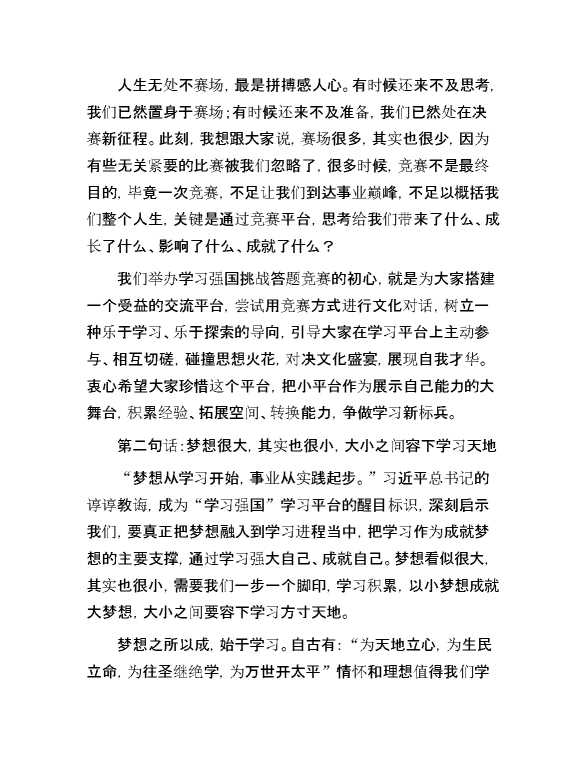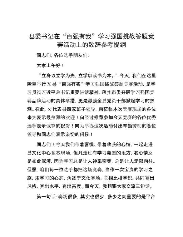 县委书记在“百强有我”学习强国挑战答题竞赛活动上的致辞参考提纲 2025-01-14 Word模板 55 购买前,请一定要先点击这里看看,欢迎持续关注,精彩模板每天推送 预览结束,本文件为word文档,一共4页,共1585字,请购买后,下载后查看 购买前,请一定要先点击这里看看,欢迎持续关注,精彩模板每天推送 资源下载下载价格29 RMBVIP免费升级VIP点击检测网盘有效后购买有任何充值和下载问题请加微信:xuexixuexi66 0 演讲发言