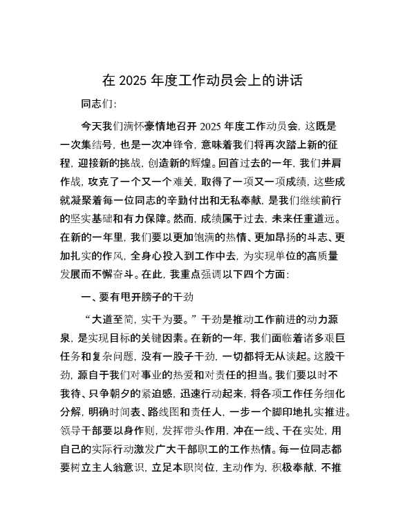 在2025年度工作动员会上的讲话 2025-01-14 Word模板 60 购买前,请一定要先点击这里看看,欢迎持续关注,精彩模板每天推送 预览结束,本文件为word文档,一共4页,共1496字,请购买后,下载后查看 购买前,请一定要先点击这里看看,欢迎持续关注,精彩模板每天推送 资源下载下载价格29 RMBVIP免费升级VIP点击检测网盘有效后购买有任何充值和下载问题请加微信:xuexixuexi66 0 演讲发言