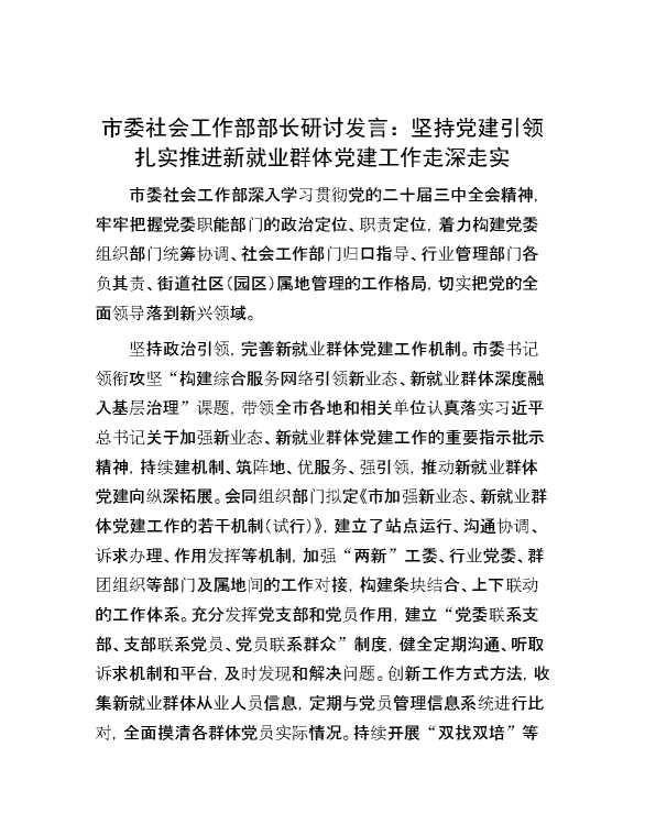 市委社会工作部部长研讨发言:坚持党建引领 扎实推进新就业群体党建工作走深走实 2025-01-14 Word模板 55 购买前,请一定要先点击这里看看,欢迎持续关注,精彩模板每天推送 预览结束,本文件为word文档,一共3页,共1358字,请购买后,下载后查看 购买前,请一定要先点击这里看看,欢迎持续关注,精彩模板每天推送 资源下载下载价格29 RMBVIP免费升级VIP点击检测网盘有效后购买有任何充值和下载问题请加微信:xuexixuexi66 0 演讲发言
