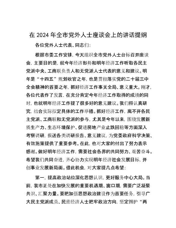在2024年全市党外人士座谈会上的讲话提纲 2025-01-14 Word模板 59 购买前,请一定要先点击这里看看,欢迎持续关注,精彩模板每天推送 预览结束,本文件为word文档,一共6页,共2918字,请购买后,下载后查看 购买前,请一定要先点击这里看看,欢迎持续关注,精彩模板每天推送 资源下载下载价格29 RMBVIP免费升级VIP点击检测网盘有效后购买有任何充值和下载问题请加微信:xuexixuexi66 0 演讲发言