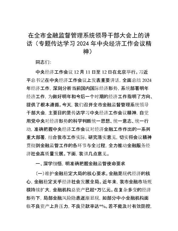 在全市金融监督管理系统领导干部大会上的讲话(专题传达学习2024年中央经济工作会议精神) 2025-01-14 Word模板 57 购买前,请一定要先点击这里看看,欢迎持续关注,精彩模板每天推送 预览结束,本文件为word文档,一共10页,共4692字,请购买后,下载后查看 购买前,请一定要先点击这里看看,欢迎持续关注,精彩模板每天推送 资源下载下载价格29 RMBVIP免费升级VIP点击检测网盘有效后购买有任何充值和下载问题请加微信:xuexixuexi66 0 演讲发言