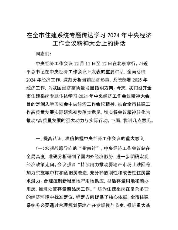 在全市住建系统专题传达学习2024年中央经济工作会议精神大会上的讲话 2025-01-14 Word模板 57 购买前,请一定要先点击这里看看,欢迎持续关注,精彩模板每天推送 预览结束,本文件为word文档,一共13页,共6420字,请购买后,下载后查看 购买前,请一定要先点击这里看看,欢迎持续关注,精彩模板每天推送 资源下载下载价格29 RMBVIP免费升级VIP点击检测网盘有效后购买有任何充值和下载问题请加微信:xuexixuexi66 0 演讲发言