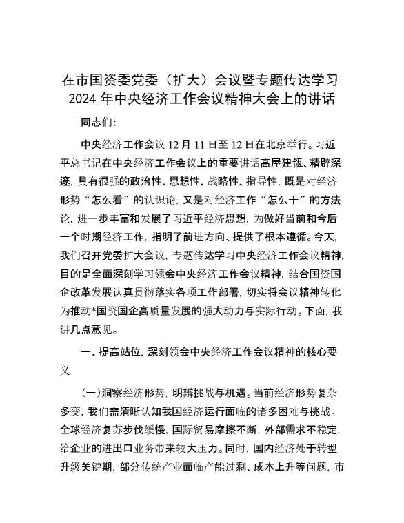 在市国资委党委(扩大)会议暨专题传达学习2024年中央经济工作会议精神大会上的讲话 2025-01-14 Word模板 58 购买前,请一定要先点击这里看看,欢迎持续关注,精彩模板每天推送 预览结束,本文件为word文档,一共12页,共5801字,请购买后,下载后查看 购买前,请一定要先点击这里看看,欢迎持续关注,精彩模板每天推送 资源下载下载价格29 RMBVIP免费升级VIP点击检测网盘有效后购买有任何充值和下载问题请加微信:xuexixuexi66 0 演讲发言