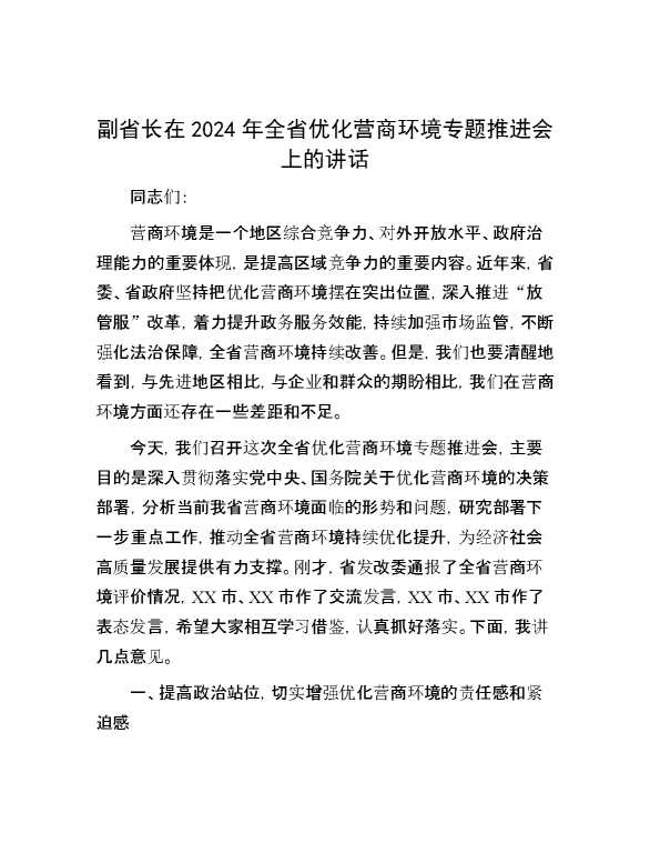 副省长在2024年全省优化营商环境专题推进会上的讲话 2025-01-14 Word模板 55 购买前,请一定要先点击这里看看,欢迎持续关注,精彩模板每天推送 预览结束,本文件为word文档,一共6页,共2381字,请购买后,下载后查看 购买前,请一定要先点击这里看看,欢迎持续关注,精彩模板每天推送 资源下载下载价格29 RMBVIP免费升级VIP点击检测网盘有效后购买有任何充值和下载问题请加微信:xuexixuexi66 0 演讲发言