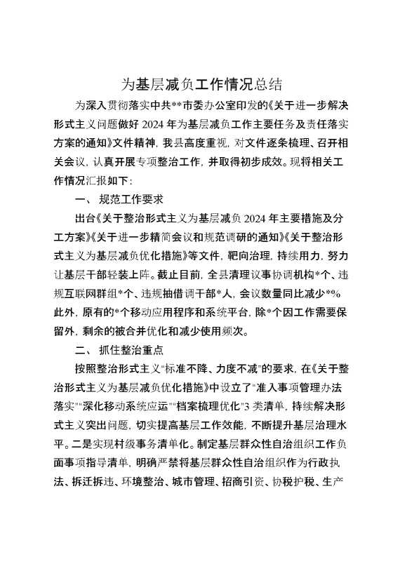 为基层减负工作情况总结 2025-01-24 Word模板 94 购买前,请一定要先点击这里看看,欢迎持续关注,精彩模板每天推送 预览结束,本文件为word文档,一共3页,共1129字,请购买后,下载后查看 购买前,请一定要先点击这里看看,欢迎持续关注,精彩模板每天推送 资源下载下载价格29 RMBVIP免费升级VIP点击检测网盘有效后购买有任何充值和下载问题请加微信:xuexixuexi66 0 总结汇报