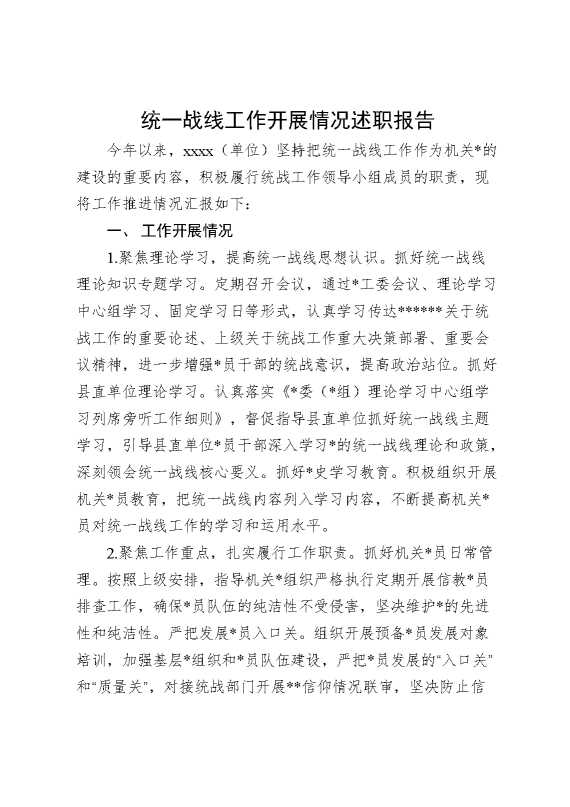统一战线工作开展情况述职报告 2025-01-24 Word模板 117 购买前,请一定要先点击这里看看,欢迎持续关注,精彩模板每天推送 预览结束,本文件为word文档,一共3页,共1356字,请购买后,下载后查看 购买前,请一定要先点击这里看看,欢迎持续关注,精彩模板每天推送 资源下载下载价格29 RMBVIP免费升级VIP点击检测网盘有效后购买有任何充值和下载问题请加微信:xuexixuexi66 0 总结汇报