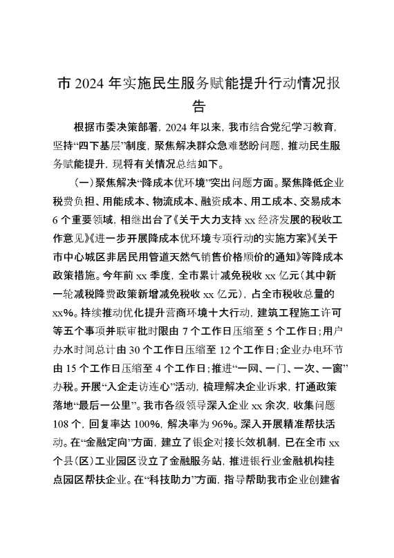 市2024年实施民生服务赋能提升行动情况报告 2025-01-24 Word模板 96 购买前,请一定要先点击这里看看,欢迎持续关注,精彩模板每天推送 预览结束,本文件为word文档,一共4页,共1965字,请购买后,下载后查看 购买前,请一定要先点击这里看看,欢迎持续关注,精彩模板每天推送 资源下载下载价格29 RMBVIP免费升级VIP点击检测网盘有效后购买有任何充值和下载问题请加微信:xuexixuexi66 0 总结汇报