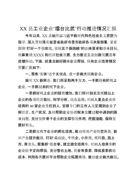 XX县工业企业“擂台比武”行动推进情况汇报 2025-01-24 Word模板 92 购买前,请一定要先点击这里看看,欢迎持续关注,精彩模板每天推送 预览结束,本文件为word文档,一共4页,共1556字,请购买后,下载后查看 购买前,请一定要先点击这里看看,欢迎持续关注,精彩模板每天推送 资源下载下载价格29 RMBVIP免费升级VIP点击检测网盘有效后购买有任何充值和下载问题请加微信:xuexixuexi66 0 总结汇报