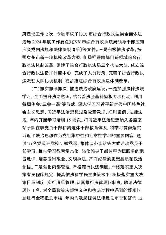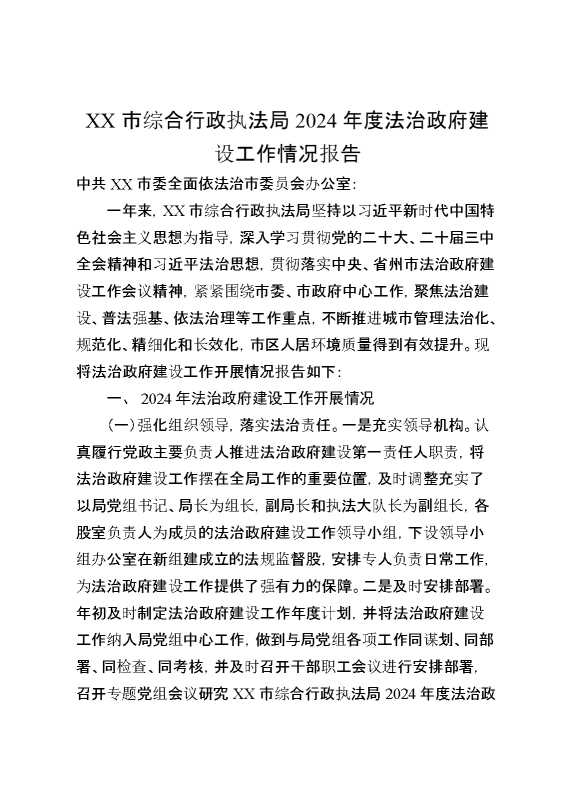 XX市综合行政执法局2024年度法治政府建设工作情况报告(1) 2025-01-24 Word模板 103 购买前,请一定要先点击这里看看,欢迎持续关注,精彩模板每天推送 预览结束,本文件为word文档,一共8页,共4308字,请购买后,下载后查看 购买前,请一定要先点击这里看看,欢迎持续关注,精彩模板每天推送 资源下载下载价格29 RMBVIP免费升级VIP点击检测网盘有效后购买有任何充值和下载问题请加微信:xuexixuexi66 0 总结汇报