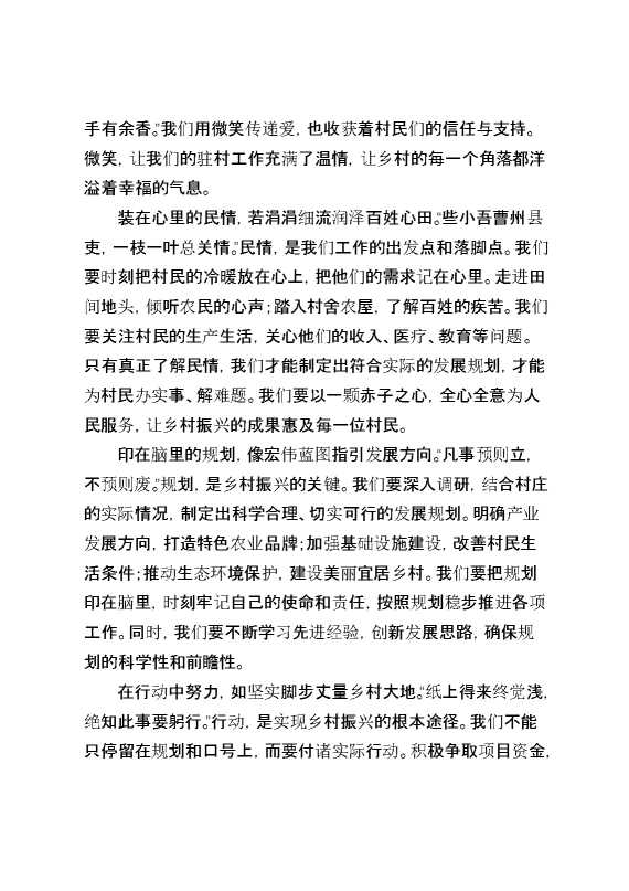 驻村干部当以最佳状态,书写乡村振兴壮丽篇章——驻村干部发言稿 2025-01-24 Word模板 84 购买前,请一定要先点击这里看看,欢迎持续关注,精彩模板每天推送 预览结束,本文件为word文档,一共4页,共1550字,请购买后,下载后查看 购买前,请一定要先点击这里看看,欢迎持续关注,精彩模板每天推送 资源下载下载价格29 RMBVIP免费升级VIP立即购买有任何充值和下载问题请加微信:xuexixuexi66 0 演讲发言